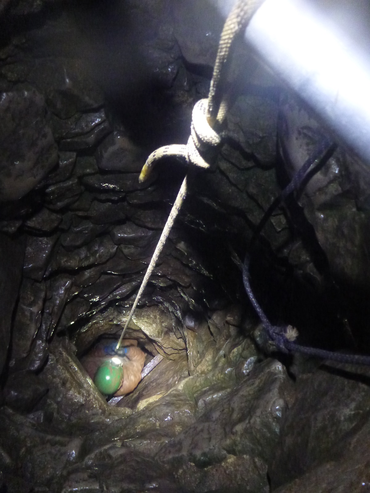 The dig: The alcove just above the Y-hang has a small passage which slowly ascends to a pinch, at the pinch a large boulder half blocks the way on. We knew from previous trips that the boulder moves but weren’t fully sure if the boulder would fit through the pinch. Rob made his best digging away around the boulder then managed to squeeze past. He concluded how tricky it would be the move from above so came back down. Now he successfully moved the boulder down the passage, it only stopping when chocked between his head and the wall. He struggled for a while then shook it off being an ‘ard get that he is. Finally after 10 minutes of bashing with a lump hammer it still didn’t break but after getting the crowbar stuck and some great advice from me he managed to roll it back.