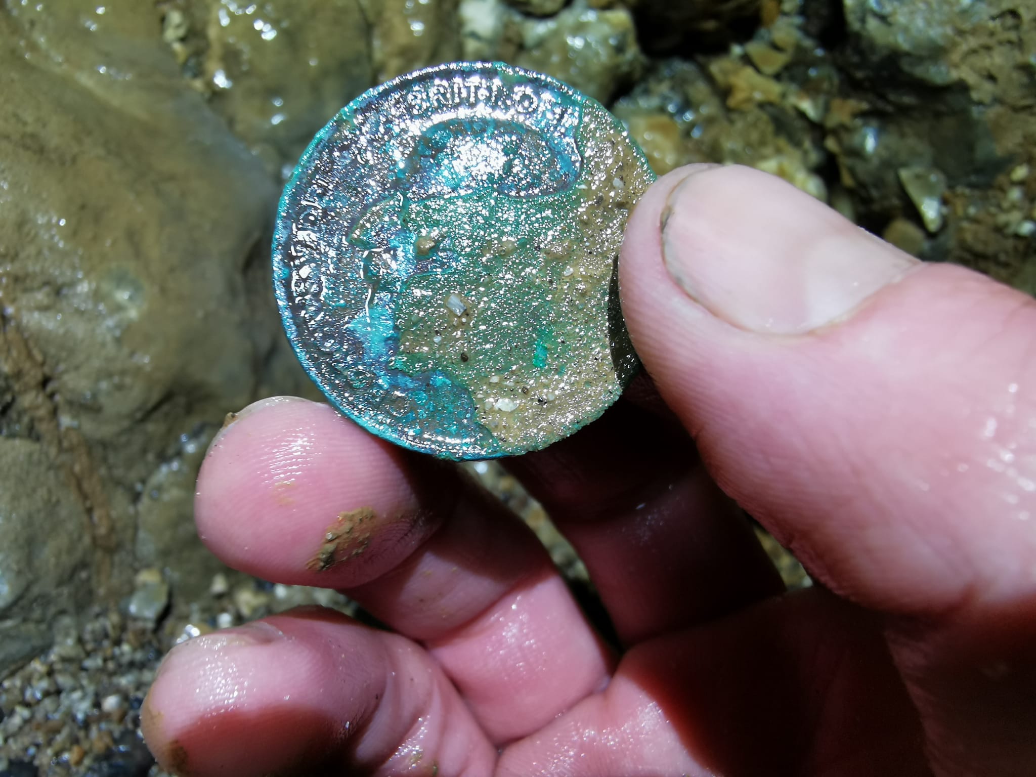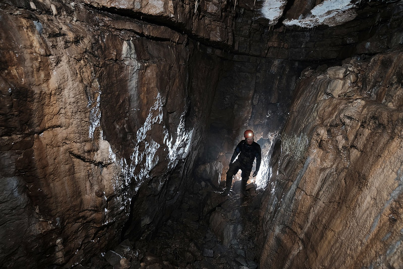 To the South the rift continues and quickly exudes a strange feel of actual, proper cave, with muddy puddles and crawling about. We weren’t prepared for this and had to readjust our mindset slightly before continuing. Numerous ways lead off in all directions and we split up to go bagging. None of the leads are big but they are certainly interesting. In places it looks like the miners actually dug through the sediment fill to explore veins beyond. The first recorded cave diggers?!? Jon’s artifact finding was in top notch form, including bagging a King George V penny coin. Again, what is this doing down here?! We explore a few more loops of passage and eventually make our way back to the main junction.