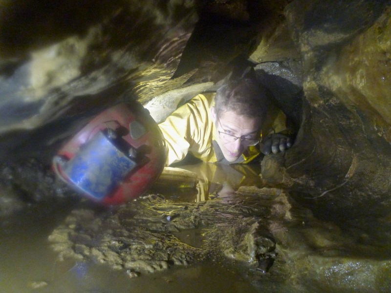 After a bit of confusion we found the way on through a very narrow section and landed at the horrid looking ‘Sting’. It’s nowhere near as bad as I thought it was going to be and we all quickly passed the wet section, only Jon made a big deal of it as he’s a tight Yorkshire man and won’t fix his broken battery box on his light. Rob ‘Kind of a big deal’ Eavis hesitated at the next bit as he thought it looked far to tight and wasn’t sure that he could fit through, it’s only the entrance to the crawl that is very tight, it soon opens up to a snug crawl. With all three of us now through the wet and crawly bit we decided that we had plenty of time so Rob suggested that we go up to Four Ways Chamber to have a look around and to survey it. After a short crawl and a traverse across a small ledge you come into four ways chambers. After a quick look around Rob had a climb up right at the end and entered into a bedding plane, he got a bit excited at this.