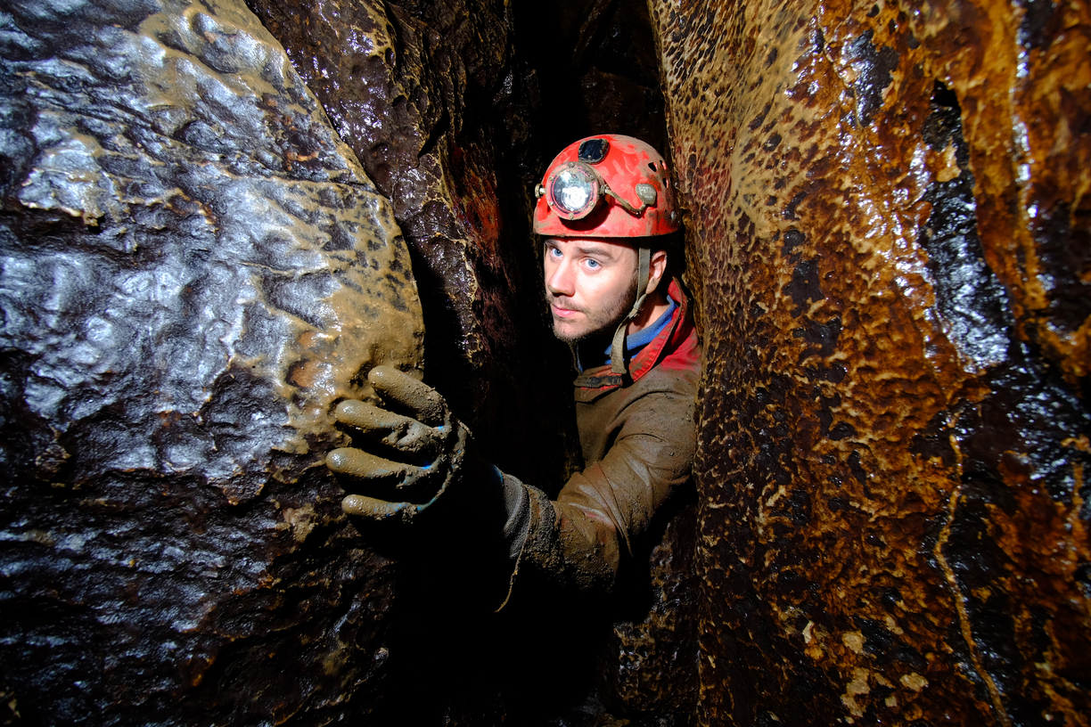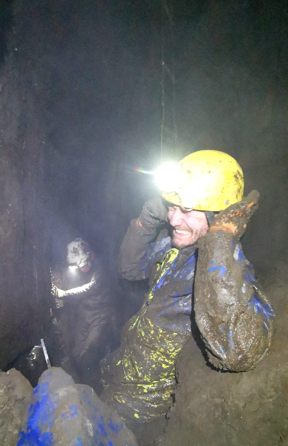 Our antics had taken more time than we anticipated so the WH tour would have to wait for another day. Goes to show though that this cave will need a LOT of work to inspect it all! We start heading out and we notice a small aven to the side was now flow quite a lot, getting us all a little aware of the potential for a flood risk. Nevertheless I go poke a few holes whilst they head off. A few minutes later I get to the silly bend near the entrance to find a Chris down the hole pulling a slight face of panic. It’s a hard hole to get out of, let alone then into the tight passage off! Jon’s overly calming words making me more anxious so I slip down the hole next to Chris. A little cuddle for old times then he climbs up my body, the gravity seemingly strong in this part of the cave right now, and actually quite easily gets himself out. A stemple here will defs work.