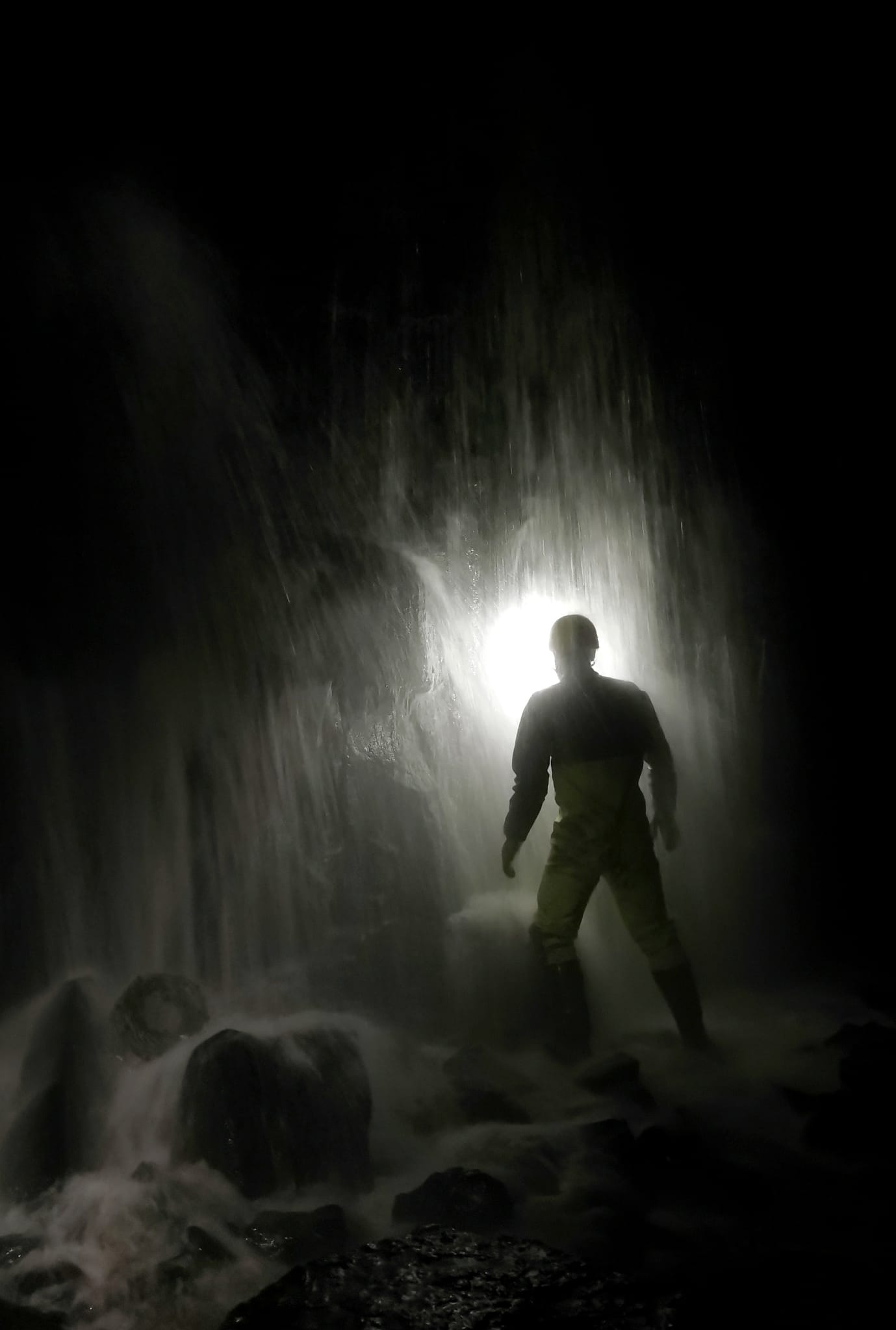 Rather than retreat Joe and I made the most of the drills battery and enlarged the rift heading west. It’s now possible to comfily access the pitch down. Hopefully this can be descended next week if water levels subside. We retreated hastily and broke surface some 3hrs later. The wash off under the waterfall was epic! The weight of the water pounding down was immense, nearly enough to knock you off your feet! Mechanics for debrief and refreshments.