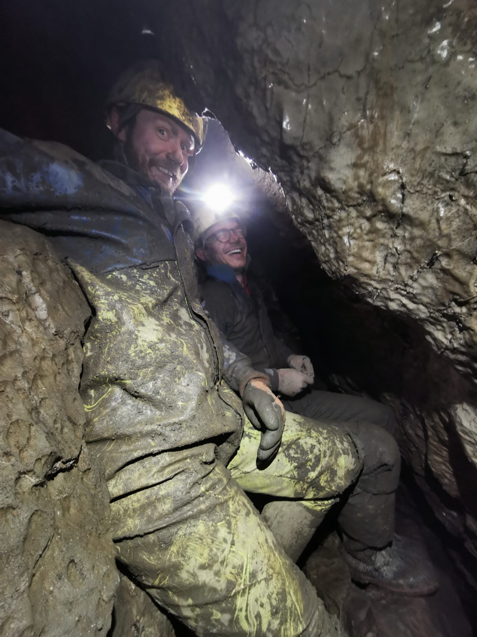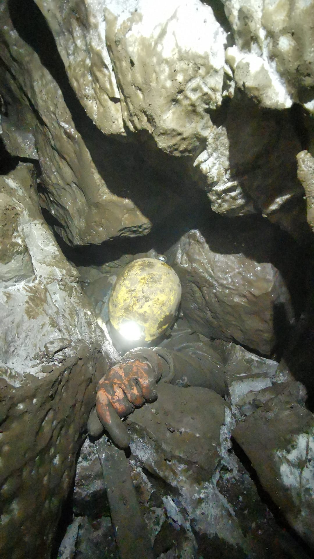 After about an hour of sweating and swearing, I was tantalisingly close to be able to squeeze through into the space beyond, but the others began to complain of cold, with their faith in my positivity waning. I just couldn’t get this one jammed rock shifted. Growing increasingly frustrated, I threw a small handful of caps in the rock for one final effort, and with a satisfying crack and rumble of rocks into the space below I could finally wriggle through!