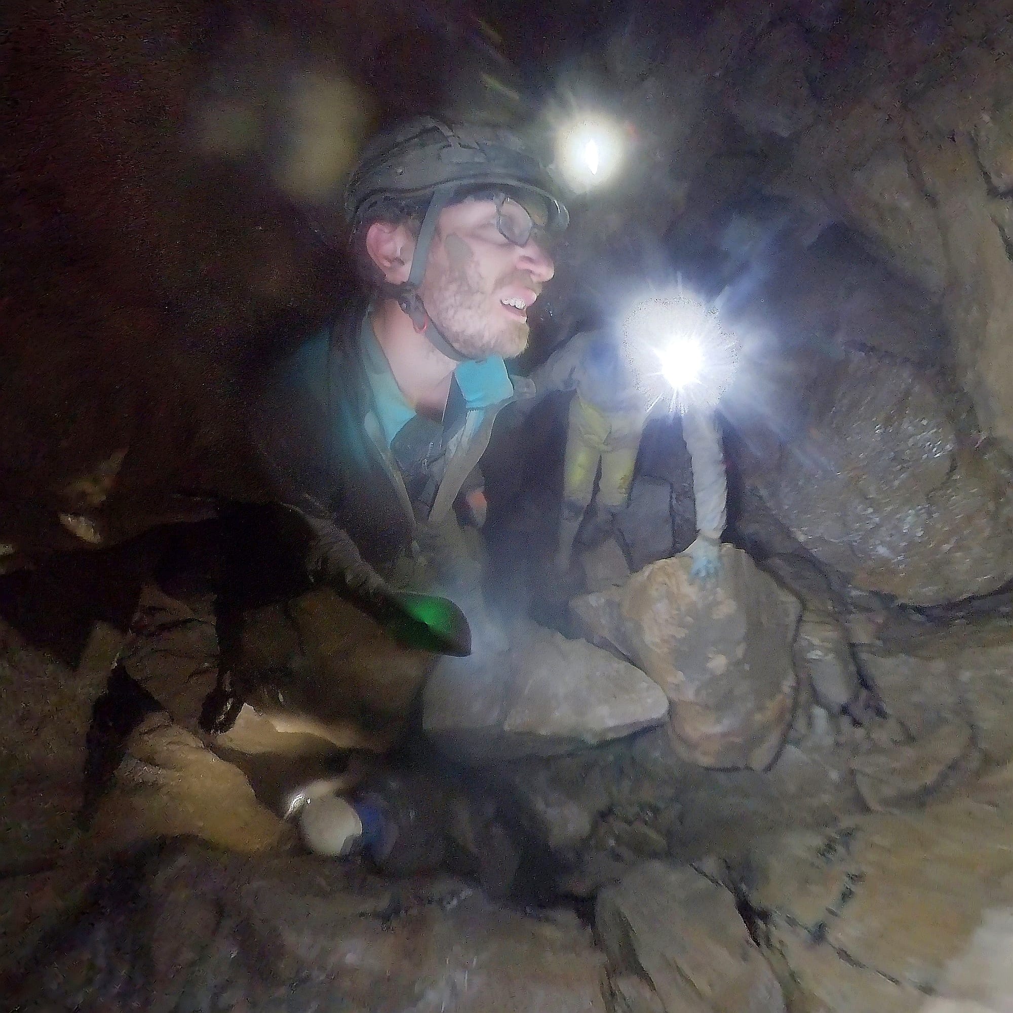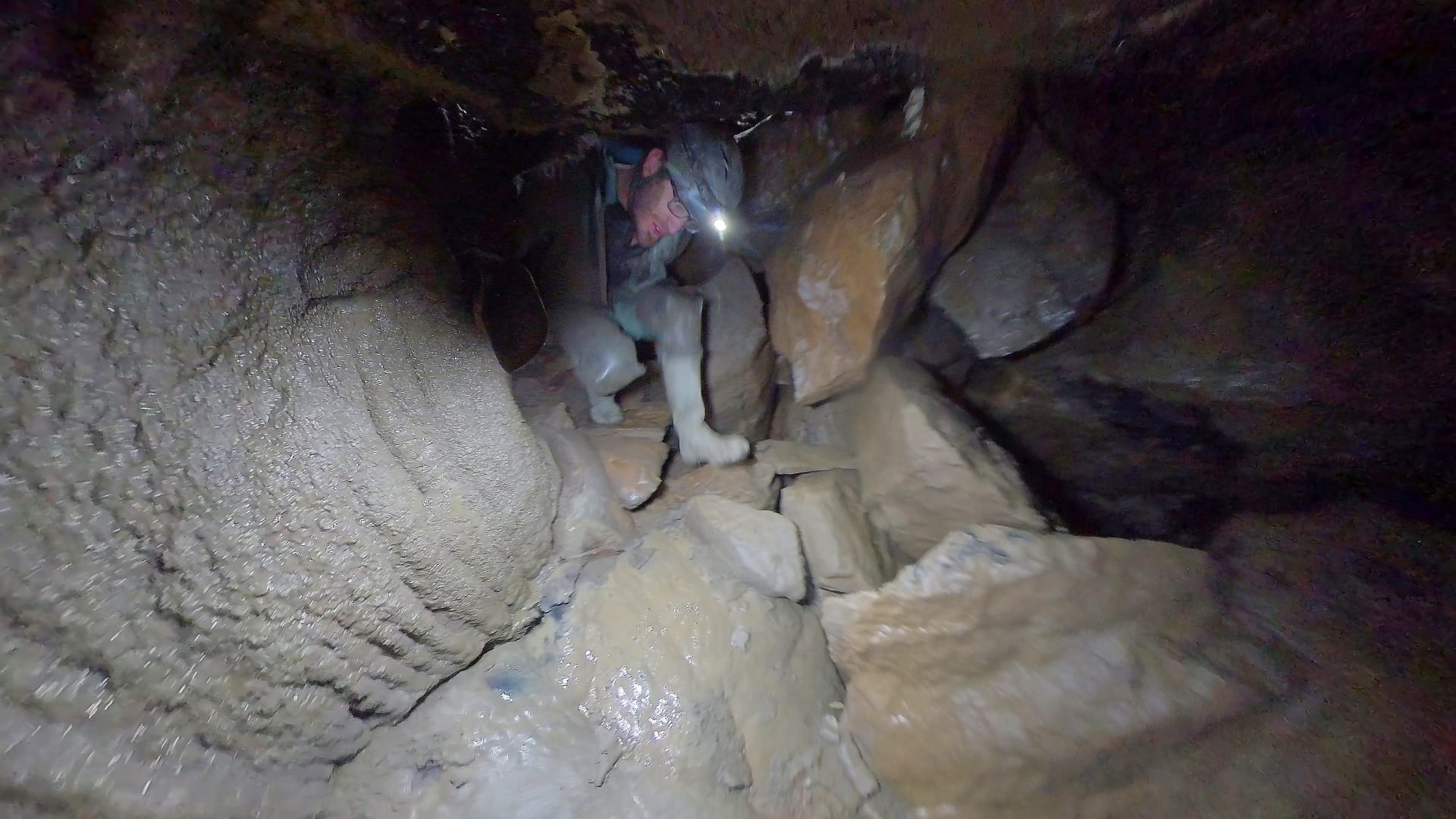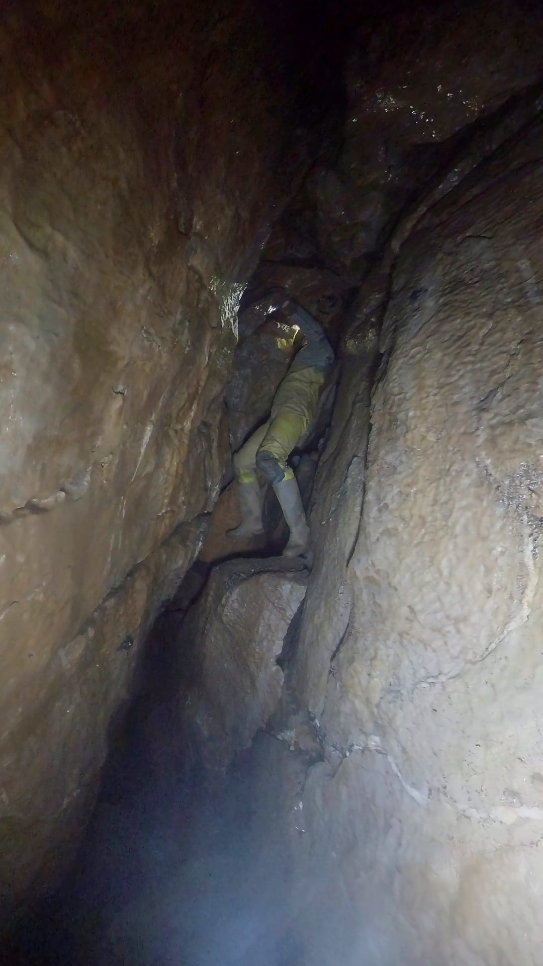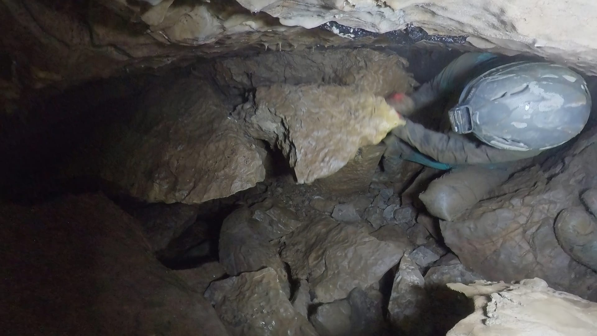 Anyways, the passage leads 10m or so to what seems to be a big boulder choke. There are holes everywhere so we split up and start pushing stuff. Excitement in the air! Some bits are muddy, some clean washed, some quite calcited with plenty of formations. It’s a weird choke, quite different from the main Waterfall Hole choke. Myself and Joe end up quite low down at one point, maybe 10m lower than where we started, digging through gaps to access a very clean washed bit that keeps going down, just needs capping.