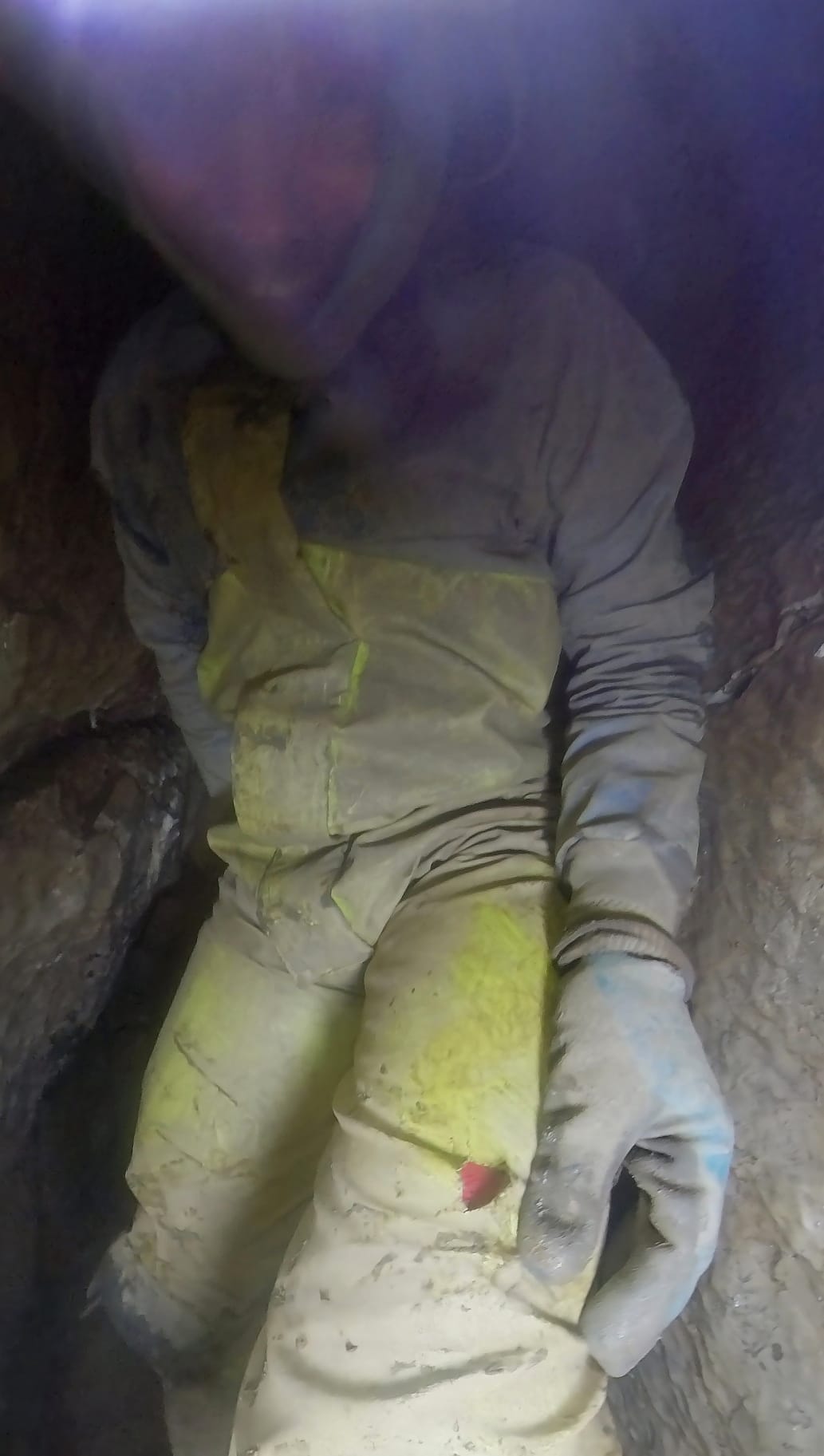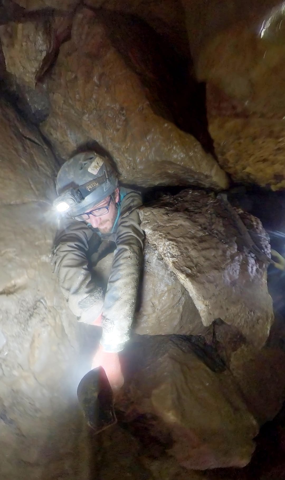 Joe comes through to join me, followed by Jon. However Jon managed to use a wrong handhold which then drops straight onto his leg. We both gasp at the blood red colour inside the fresh hole in his oversuit, only to see it was just his red furry suit! Seemingly able to still walk, we step back and look up at the other, much larger, boulders above him and realise we’ve all been quite lucky so far.