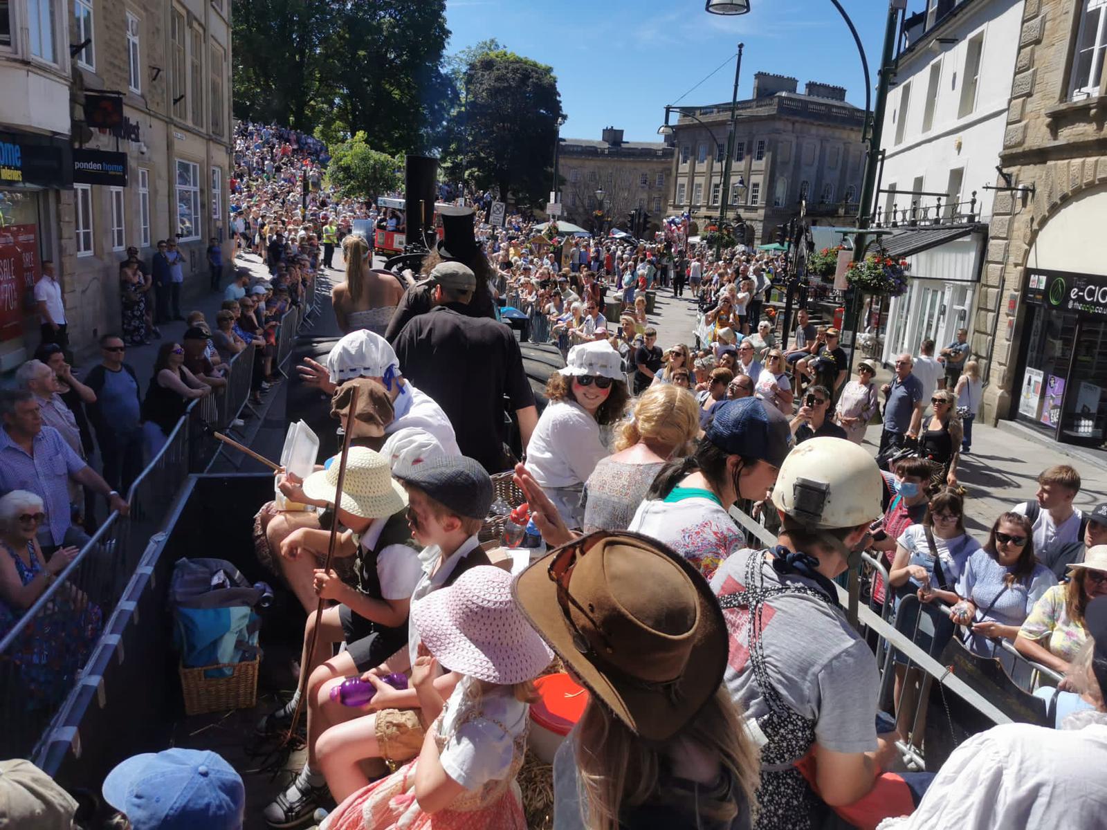 At our last AGM Hal volunteered his Victorian Steam Plough named The Chief for the Buxton Carnival. It was to celebrate the Eldon Pothole club after the video footage of the 1962 carnival was circulated. We decided to loosely stick with the theme of cross dressing or washer women as I deemed it. We had the engine out for a steam up on Friday so we parked right outside of the town centre ready to go. On the Saturday morning we arrived ready with a trailer with hay bales and not one but two engines. The steam plough and an agricultural engine owned by Jonathan. Julian got there first raring to get his dress on and he looked pretty good as a beardy blonde. Rob and Katie arrived with their minions who took to dressing as a gang of chimney sweeps. The engines burn quite a bit of coal so it was most welcome. Dave came with his minions and his wife all dressed appropriately. Luke made it after his 10k run with his wife and daughter. Jon and Miriam showed up as well as Soulless Joe and Hattie. Wendy and Mark arrived to join in on the fun. With music on the wagon, water and beer at the ready and a fair amount of sweets to toss we were at the front of the Carnival Parade. I heard it was because we were the slowest entries but I would prefer to believe the Eldon Pothole Club was the best. Buxton was bustling with the superb weather and packed crowds. We picked up Helen and Allan along the way. It was a great day to be together and have some fun as a club! Can’t wait for next year!