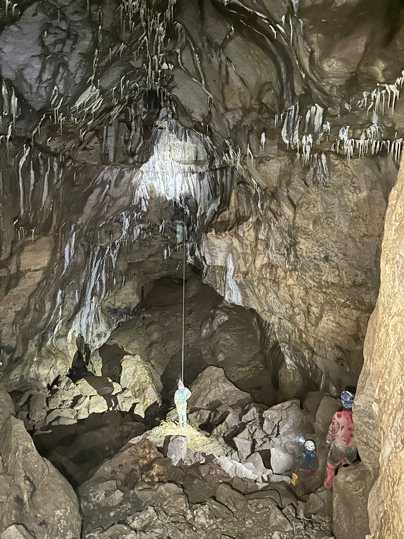 Parking up I met Jenny, Jess and Pete from the Bonsall crew. Another tall caver for the trip. Welcome! It was Pete's first time visiting winnats head cave. I had heard the report that some really inconsiderate person left a large deposit at the mouth of the cave. Yep it was still there. I enjoy being the DCA conservation officer and pick up more than my share of rubbish but I draw the line here. We carefully moved around it and started the wriggle through. We took our time as we were looking for formations and conditions for the Conservation Survey. We took some photos to support what we found. I was keen to take a photo of the wooden support beam that has been reported as cracked. We came across some nice cave mud art left behind from SUSS that pointed the way to the pub. Cheers. Once we made our way down we saw the beam. It seems to still be supporting but the crack is very clear and needs someone with some expertise to assess. We finally made it to the slot and with gravity slid through. Once at the sump we all remarked how clear and green the water appeared. There is new dive line in since I've been.