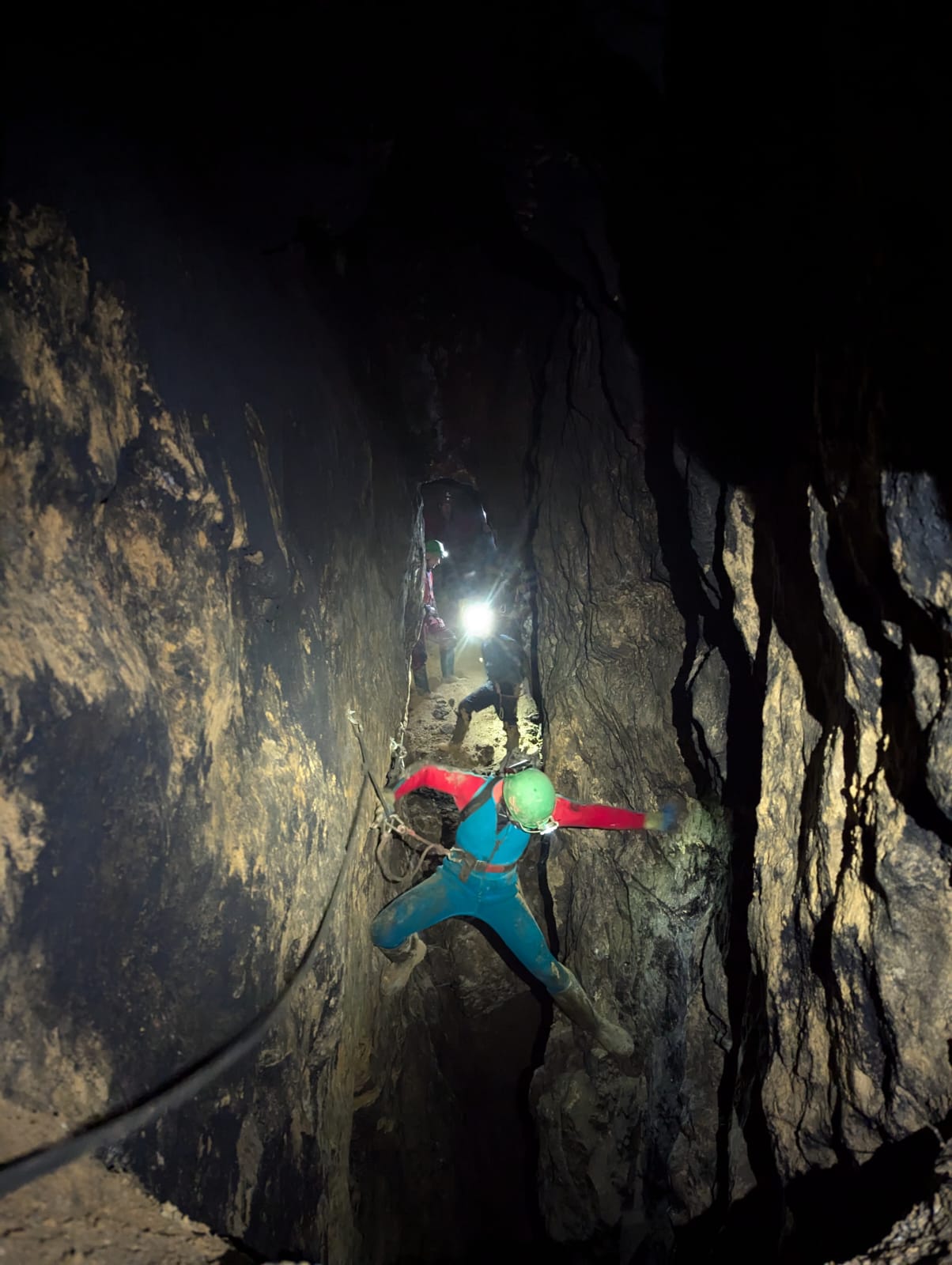 John agreed to rig and off he went. Grace is a regular to this spot, John hadn’t been in quite a while , for Bernie it was donkey’s years and this was my first time. John did a great job rigging and noticed when he got to the last bolting that you use the in situ rope to the floor. Good thing as the rope we brought was a tad too short. Down and a nice explore along the rift. Fun little traverse..whoever did that was ace. Phil? We explored down the next pitch to the dig and it is nice to see how far it goes and goes. Nice bit of conservation tape in place as well. Only one of us wanted to derig so out we went.